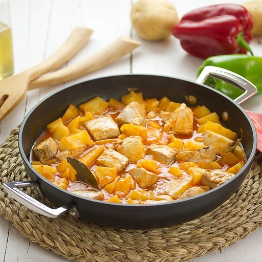 Estofado de bonito con patatas, pimientos, cebolla y tomate.