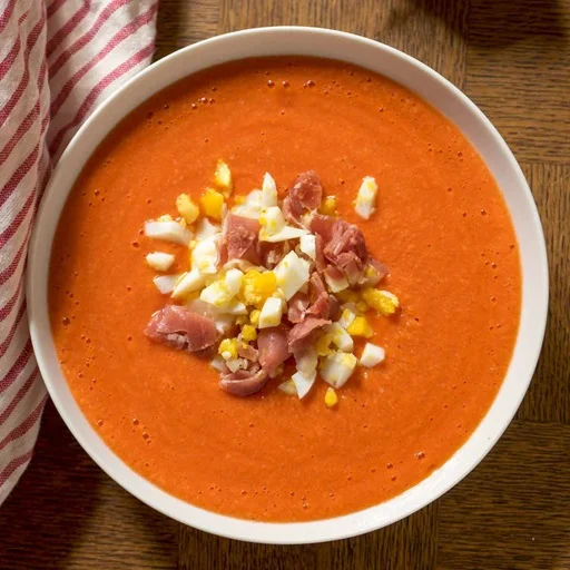 Crema espesa de tomate, pan, aceite de oliva, ajo y huevo duro picado.